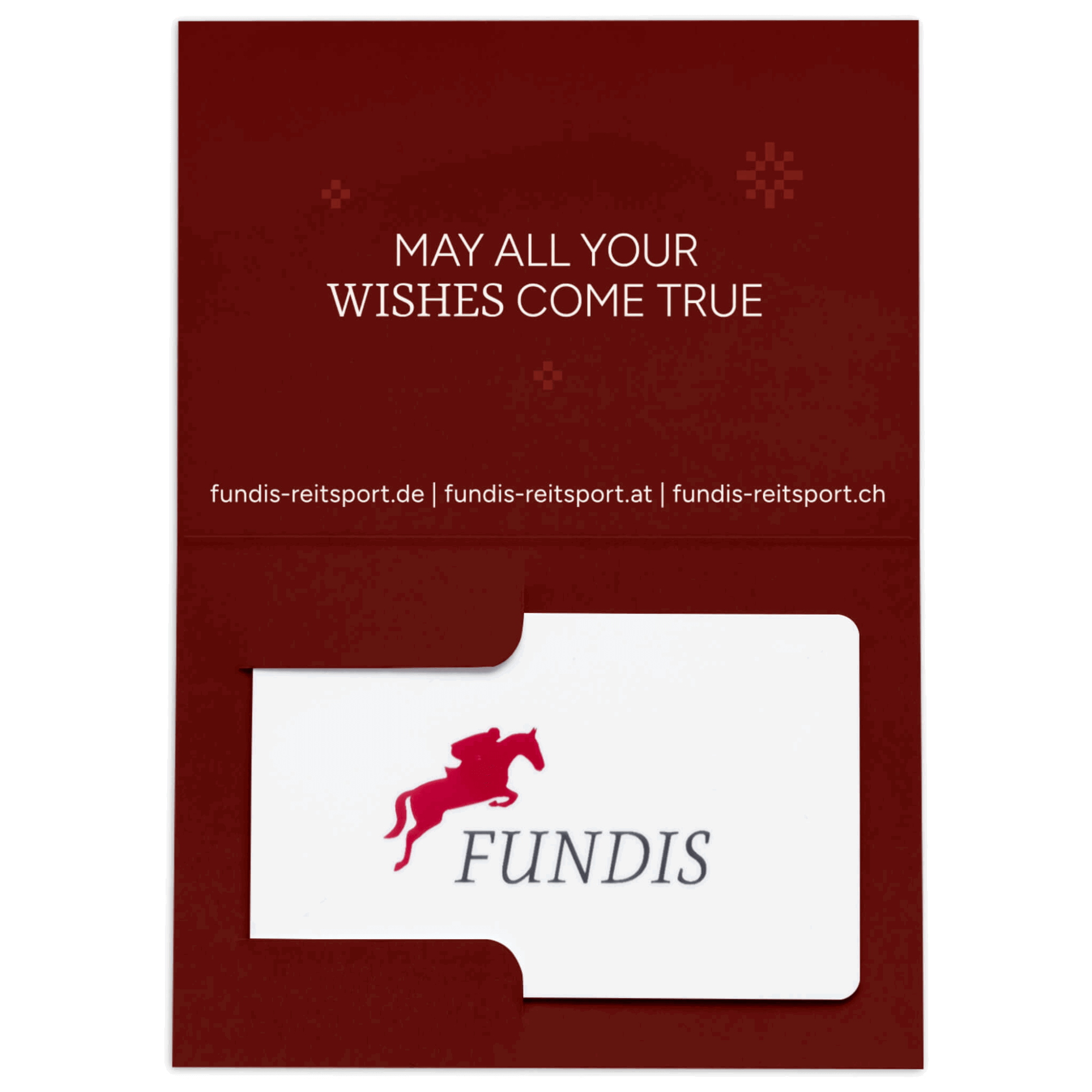 Give joy to your loved ones. The voucher card by FUNDIS Reitsport is the quick and easy gift idea for both big and small wishes all around equestrian sports. Every horse lover will find what he or she is looking for in the huge selection of horse accessories, care products and fashion. Each card is delivered in an envelope and thus can be handed over directly as a gift. A choice of different motifs, such as ribbon or Merry Christmas, can be selected depending on the occasion.