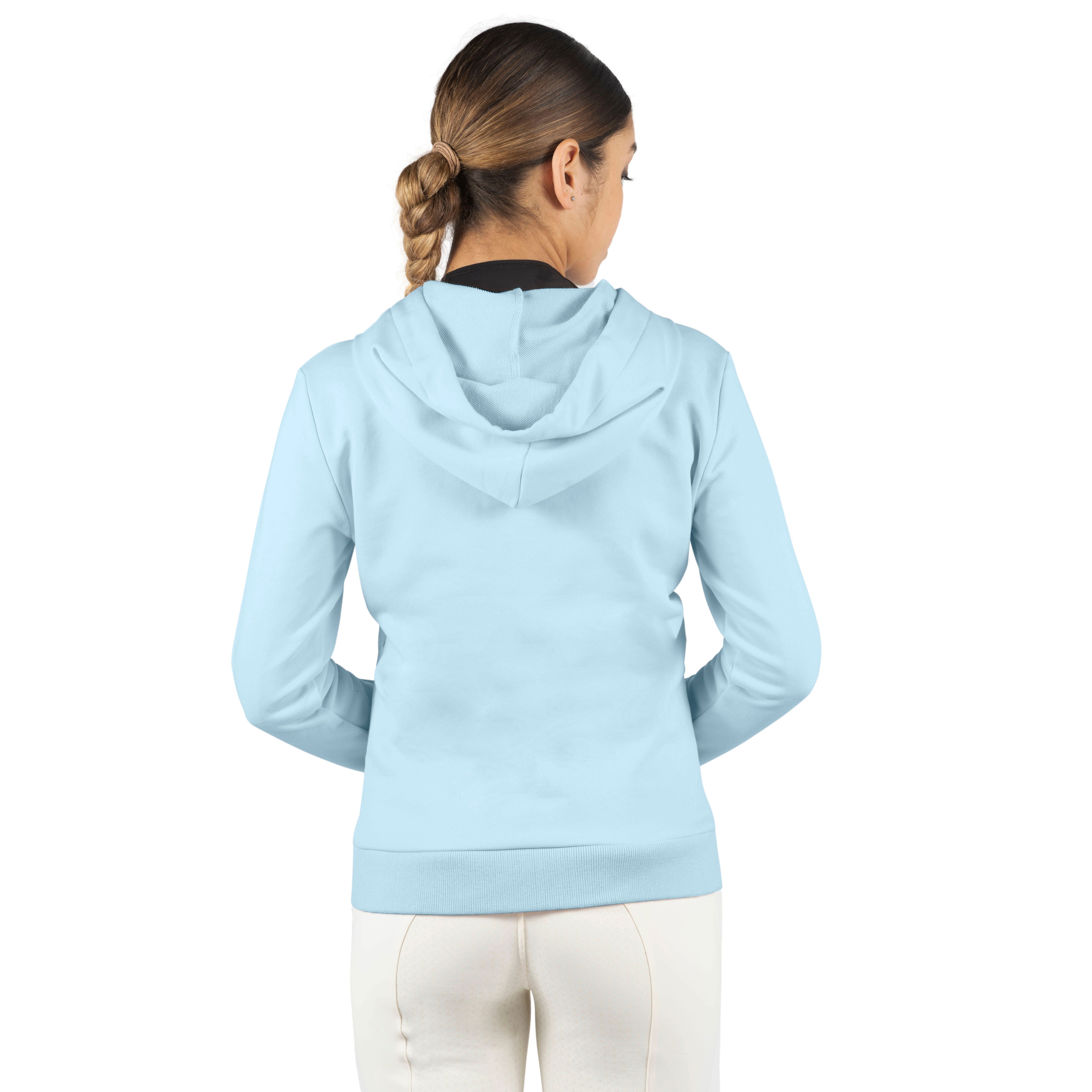The sweat jacket Bonita by Samshield comes from the spring/summer collection 2022. Thanks to its skin-friendly material blend of cotton and polyester it is the ideal companion for everyday life in the stable. In addition, the sweat jacket is breathable and quick-drying. The ribbed cuffs ensure a high wearing comfort. On the side there are pockets with hidden zippers, in which personal items can be safely stored. The hood is equipped with cords with metal ends and also has stoppers with logo embossing. The zipper is also embossed with a logo. Visually, the jacket impresses with a tone-on-tone embroidered logo and lettering on the chest, which is interwoven with shiny Lurex threads and decorated with Swarovski crystals.