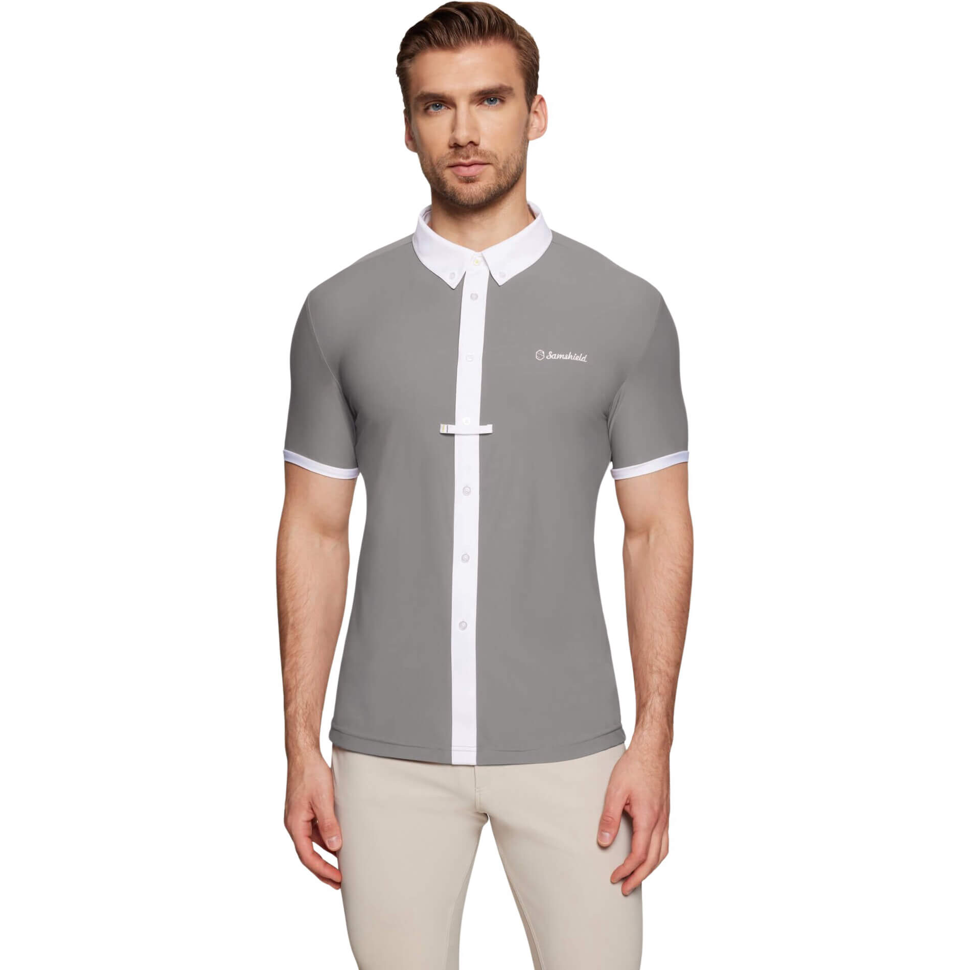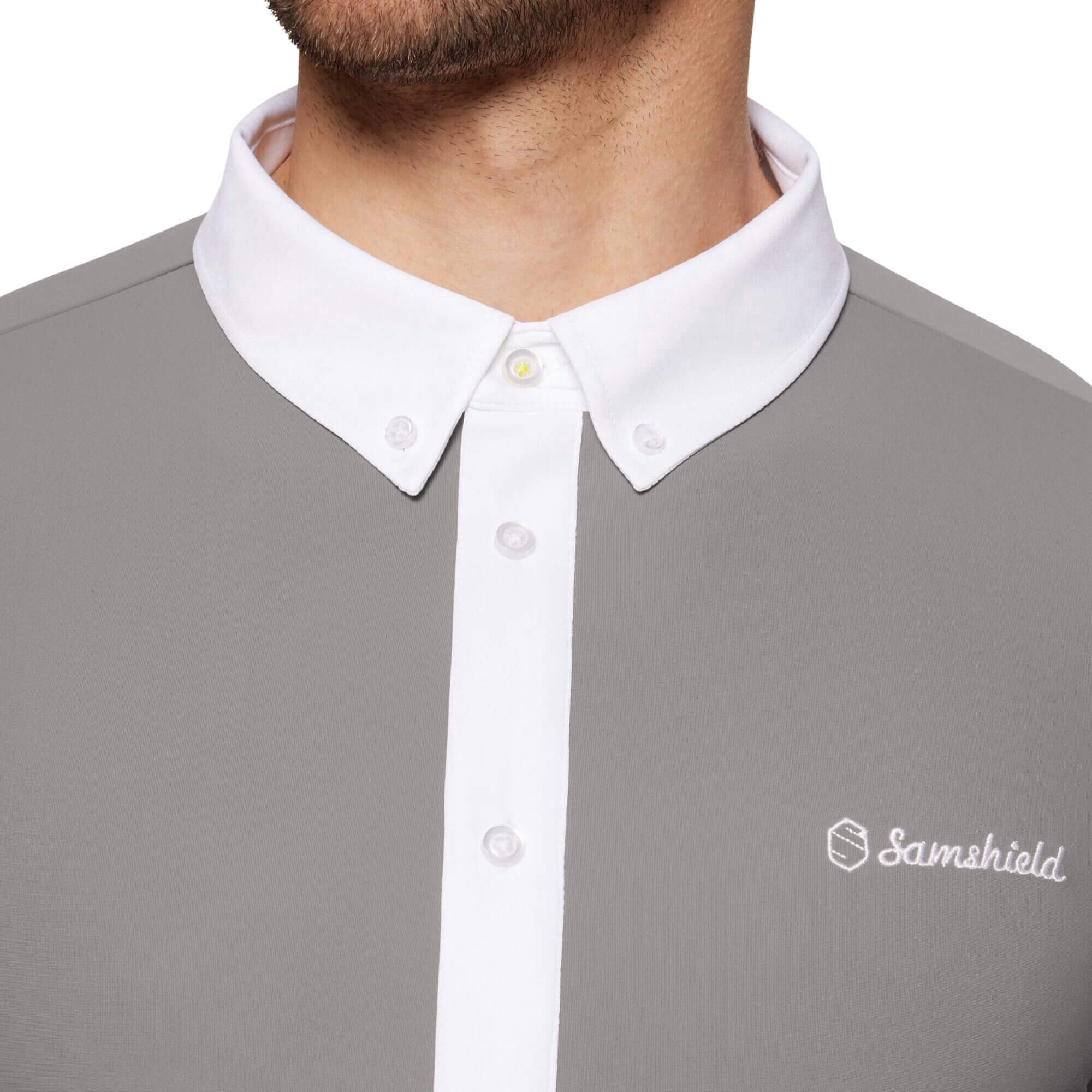 - with embroidered Samshield emblem on the chest and back of the collar